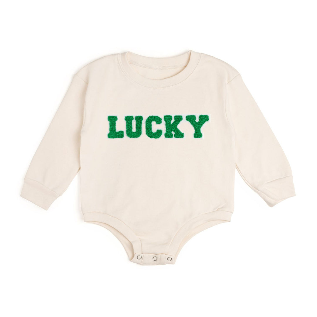 Lucky Varsity Patch St. Patrick's Day Long Sleeve Romper - Natural